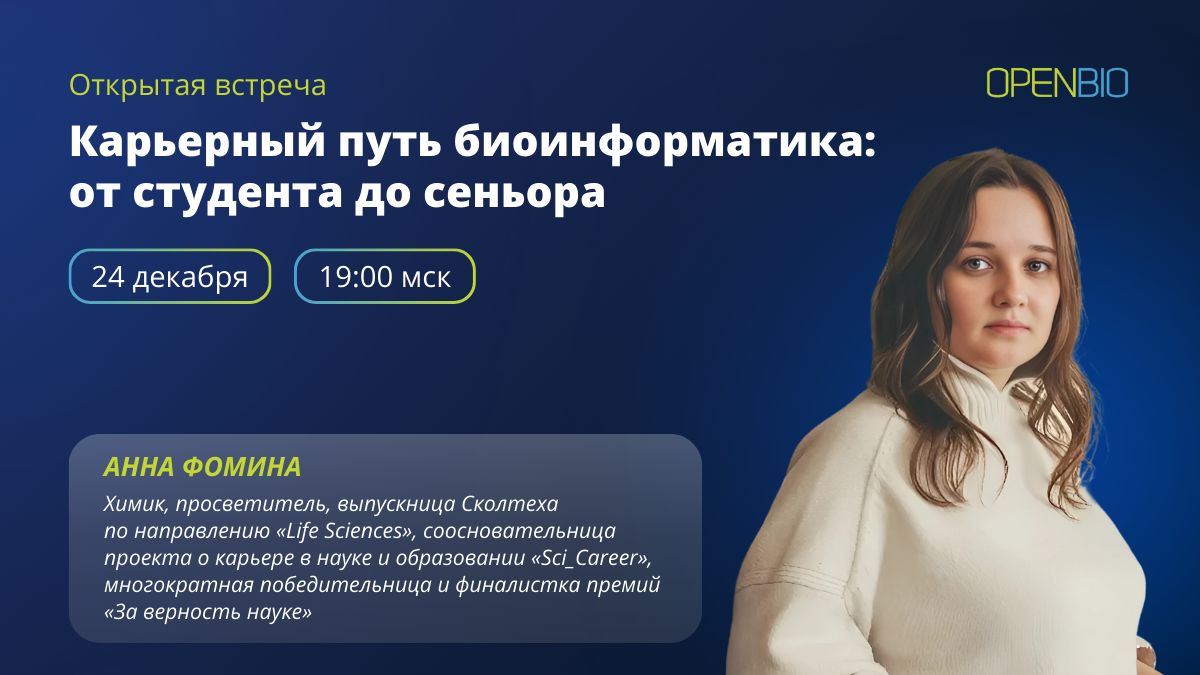 Мы продолжаем цикл онлайн-встреч из серии «Личный путь в сеньора биоинформатика»! Встреча с Анной Фоминой состоялась 24 декабря 2024 года.